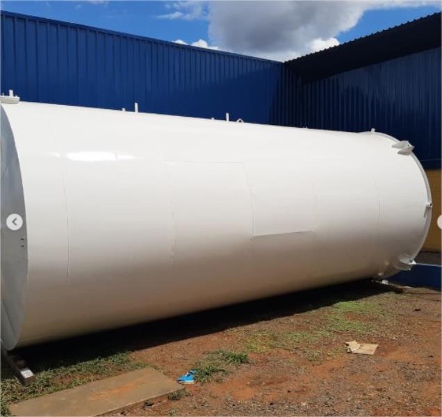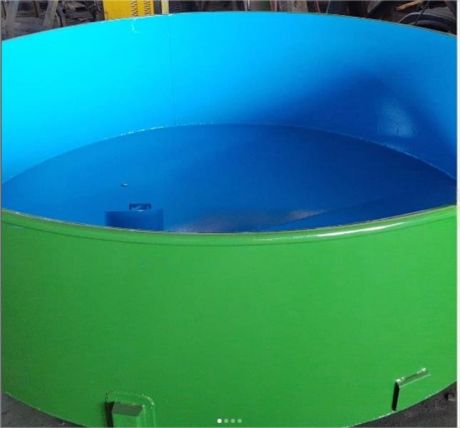 Tanque em Chapa FQ de aço e estrutura em perfil U AI 4 E 6 de aço carbono 1010/1020, Pintura interna em tinta Epoxi, pintura externa em PU.